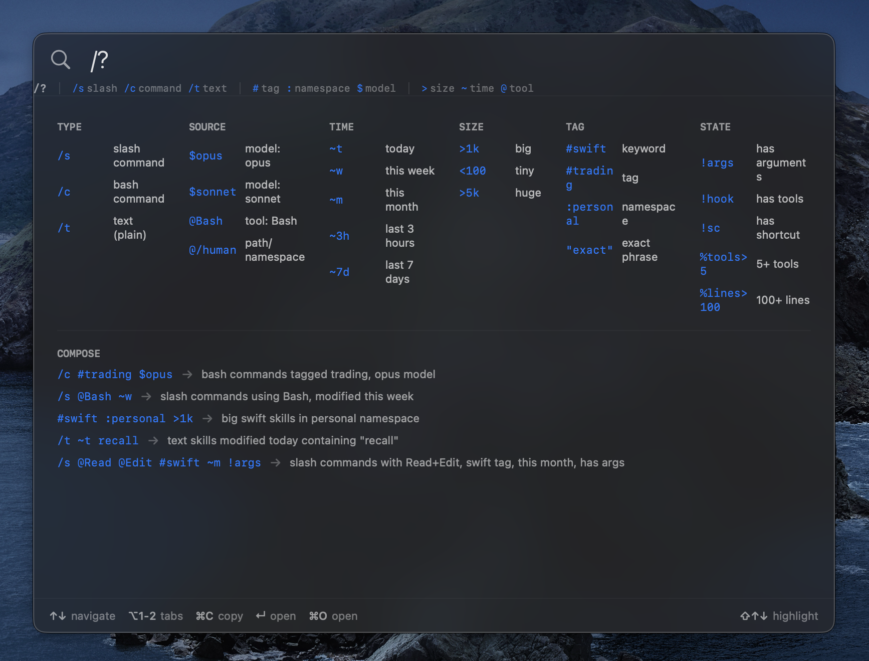 /s @Bash ~w → slash commands using Bash, this week
